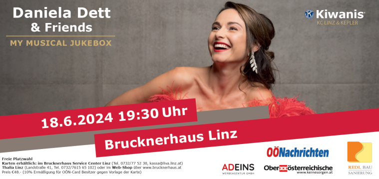 Am 18. Juni 2023 fand im Mittleren Saal des Brucknerhauses in Linz ein besonderes Charity-Konzert statt, organisiert vom Kiwanis Club „Linz & Kepler“. Unter dem Titel „My Musical Jukebox“ begeisterte Daniela Dett, das Aushängeschild des Musicalensembles am Musiktheater Linz, mit ihren Freunden das Publikum mit einem abwechslungsreichen Programm.