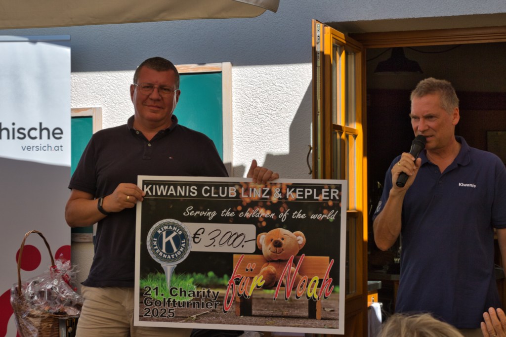 Der Präsident des Kiwanis Clubs Linz und Kepler, Klaus Dorninger, und Organisator Johannes Mühleder konnten sich über eine stolze Spendensumme von 4780 Euro freuen, die durch die großzügigen Beiträge der Sponsoren und teilnehmenden Golfer zusammenkam. Der Kiwanis Club stockte den Erlös großzügig auf 6000 Euro auf, um Noah und seiner Familie noch mehr Unterstützung zu bieten.